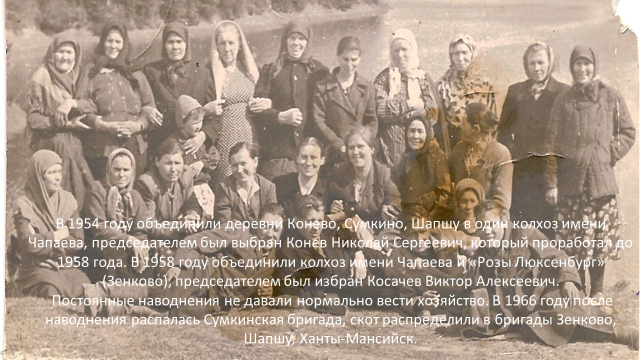 В 1930 – 31 годах в Шапше образовался колхоз «13 лет Октября». Местные жители, которые привыкли зарабатывать на жизнь своим трудом, не очень-то спешили вступать в него. «Зачем? – недоумевали деревенские, - ведь то, что нажито и так наше». Но власти были другого мнения и всех отказывающихся раскулачивали. К ним относились семьи Лыткина Бориса Петровича, Лыткина Андрея Алексеевича, Хрисанфа Тихоновича, в хозяйствах которых имелись добротные дома, лошади, коровы. Дом Лыткина Б.П был переоборудован в клуб, а дом Андрея Алексеевича перевезен в Ханты-Мансийск, в доме Хрисанфа Тихоновича разместилось правительство колхоза. Первым представителем стал Устин Федорович Лыткин.